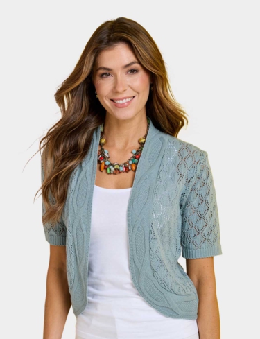 This shrug comes in an eye-catching pointelle design, a knit fabric pattern with fine, geometric cut-outs in the shape of chevrons. Not only does this give the shrug an overall delicate look, the small holes also make it more breathable on a warm day. The short sleeves add to the light feel of the shrug and the lack of buttons, zips or other fastenings make it easy to slip on.