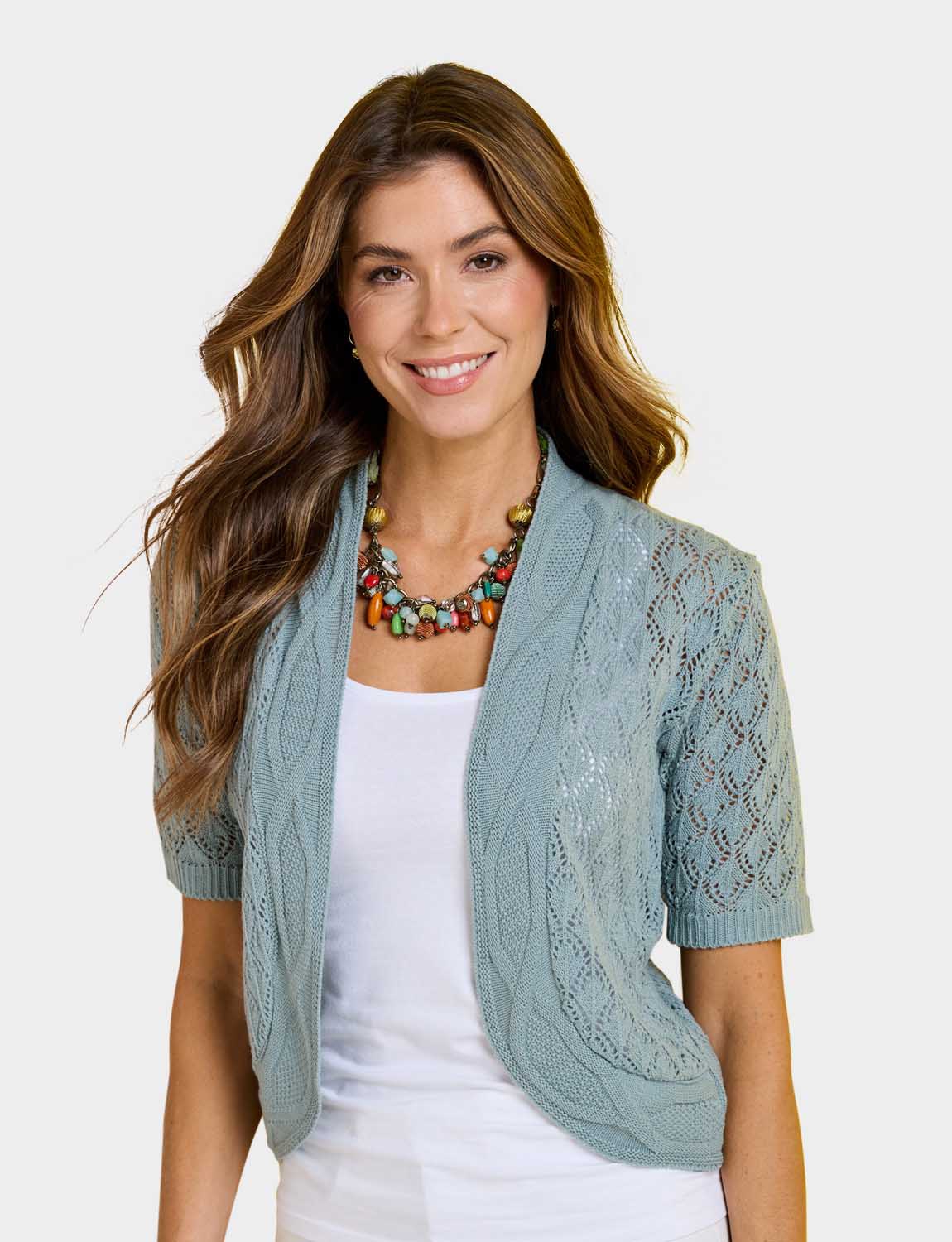 Available in a range of colours, you can be creative when choosing what to style this pointelle shrug with. Whether you pair it with a stylish top and trousers or a pretty summer dress, it will add something extra to your outfit and is sure to earn you a few compliments!