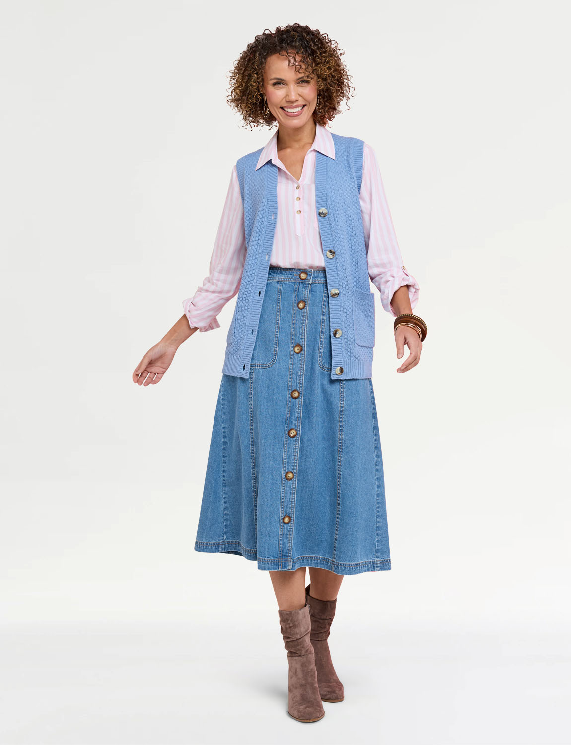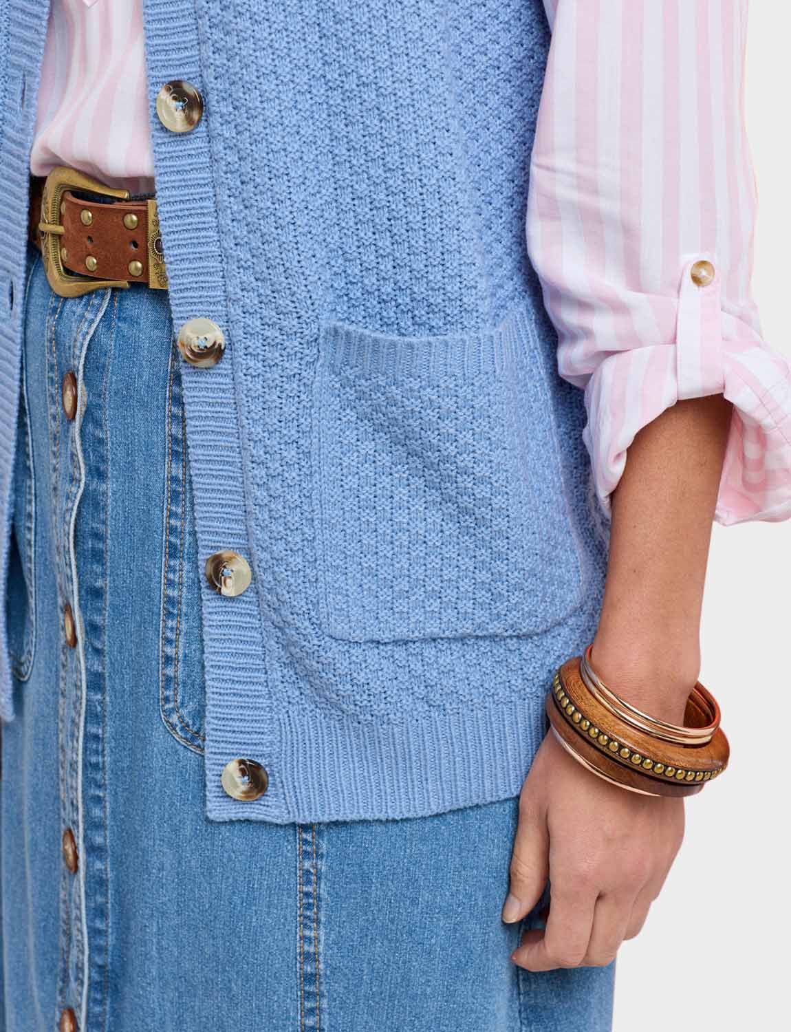 Textued basket weave effect knit with mock horn button fastening and 2 front pockets.