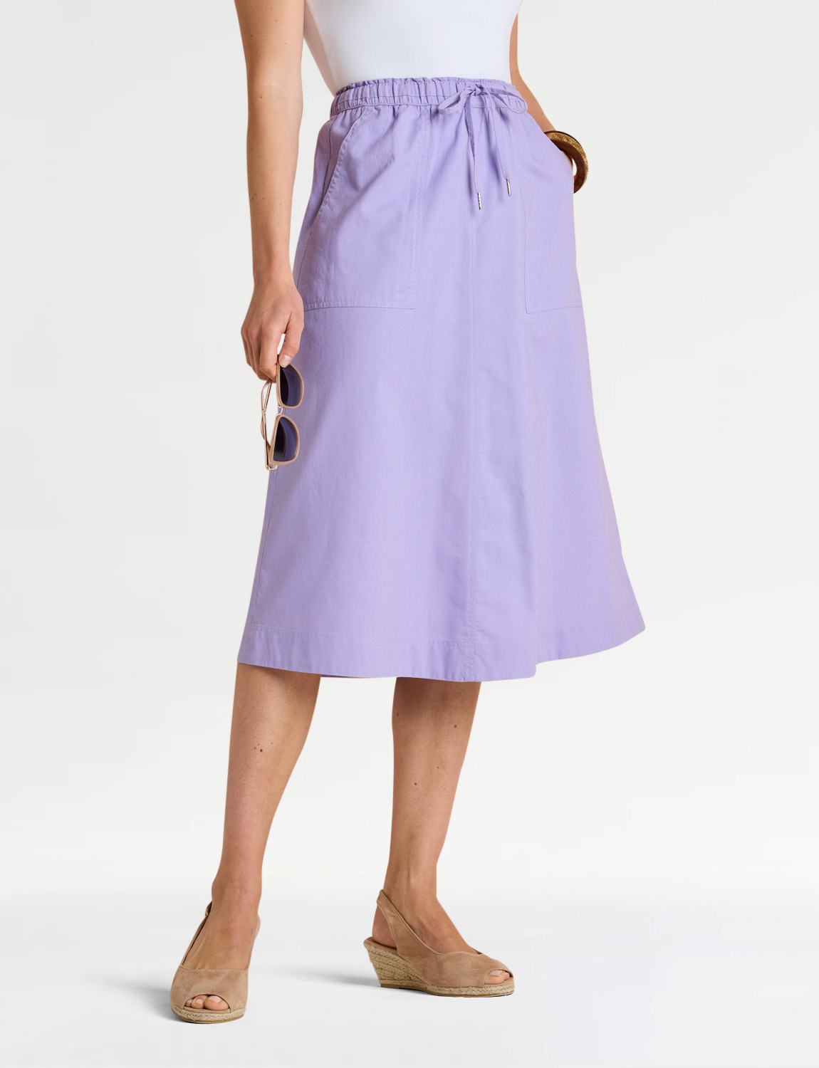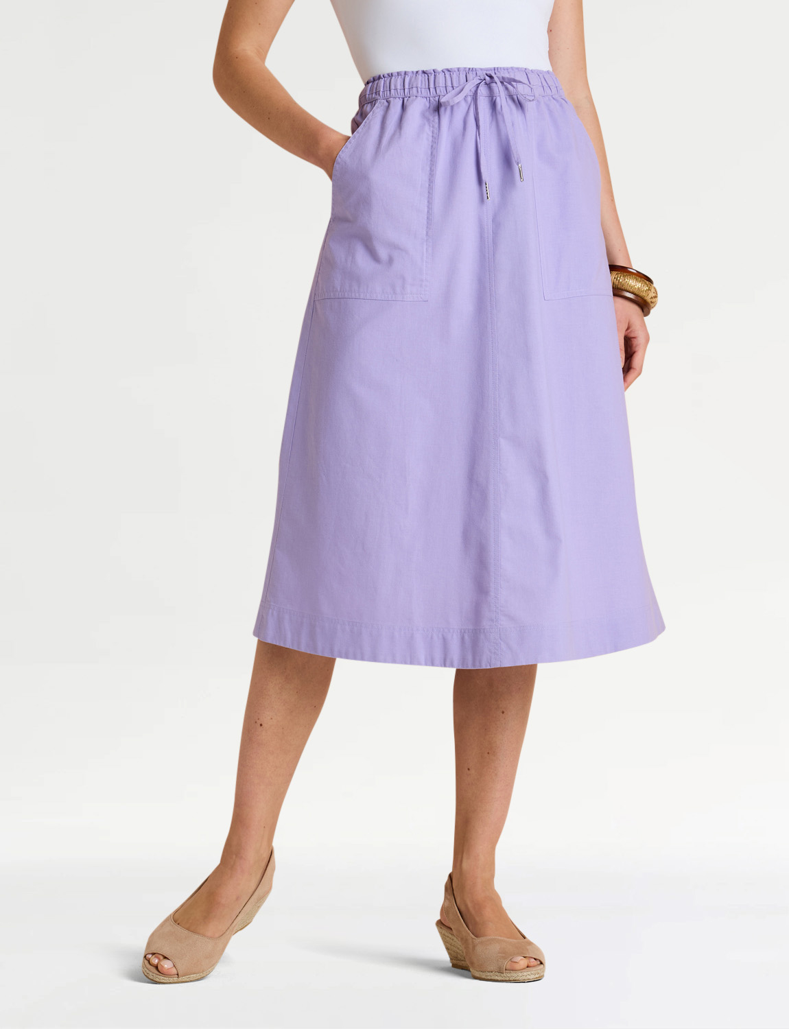 Elasticated waist skirt with 2 pockets and drawcord through waist.