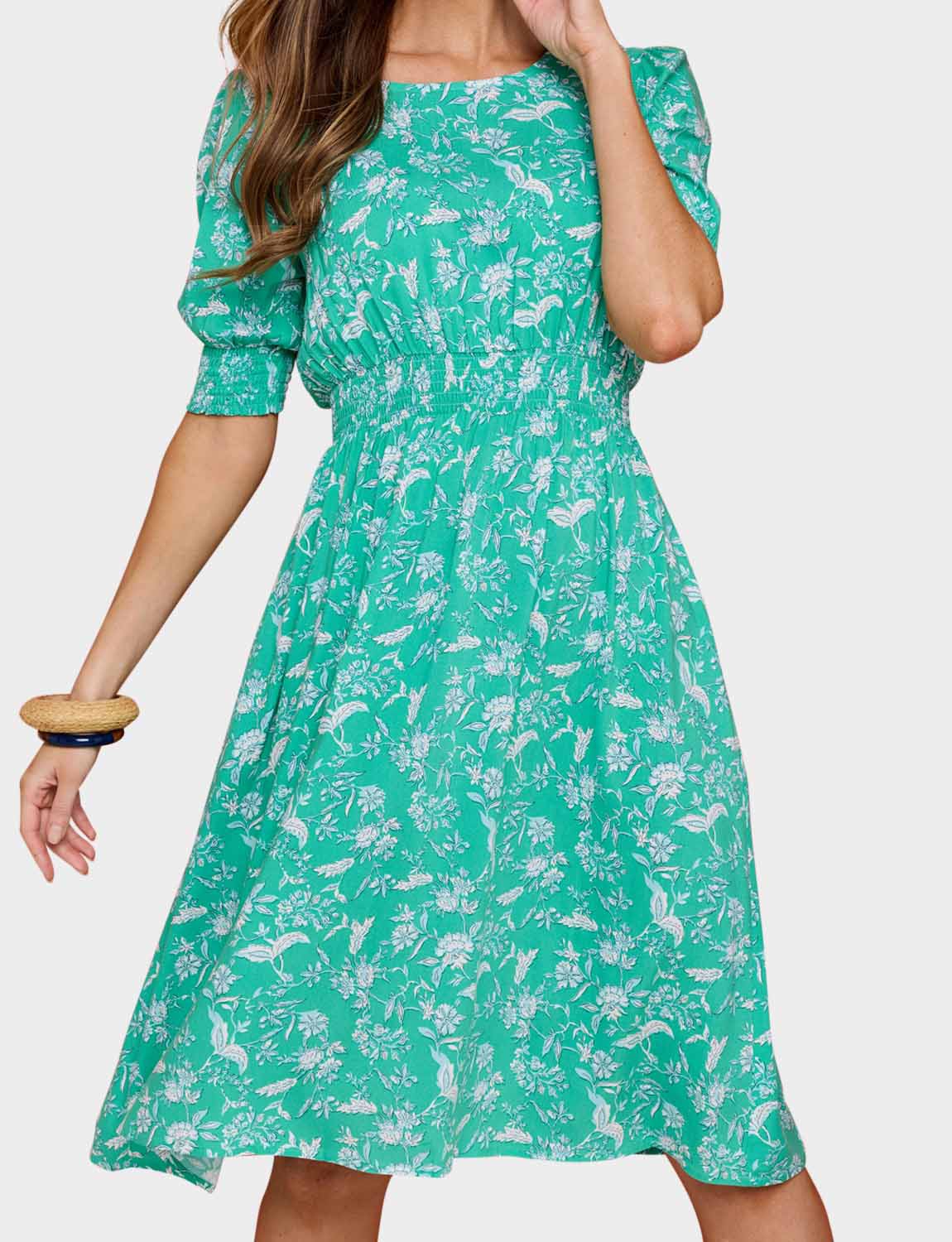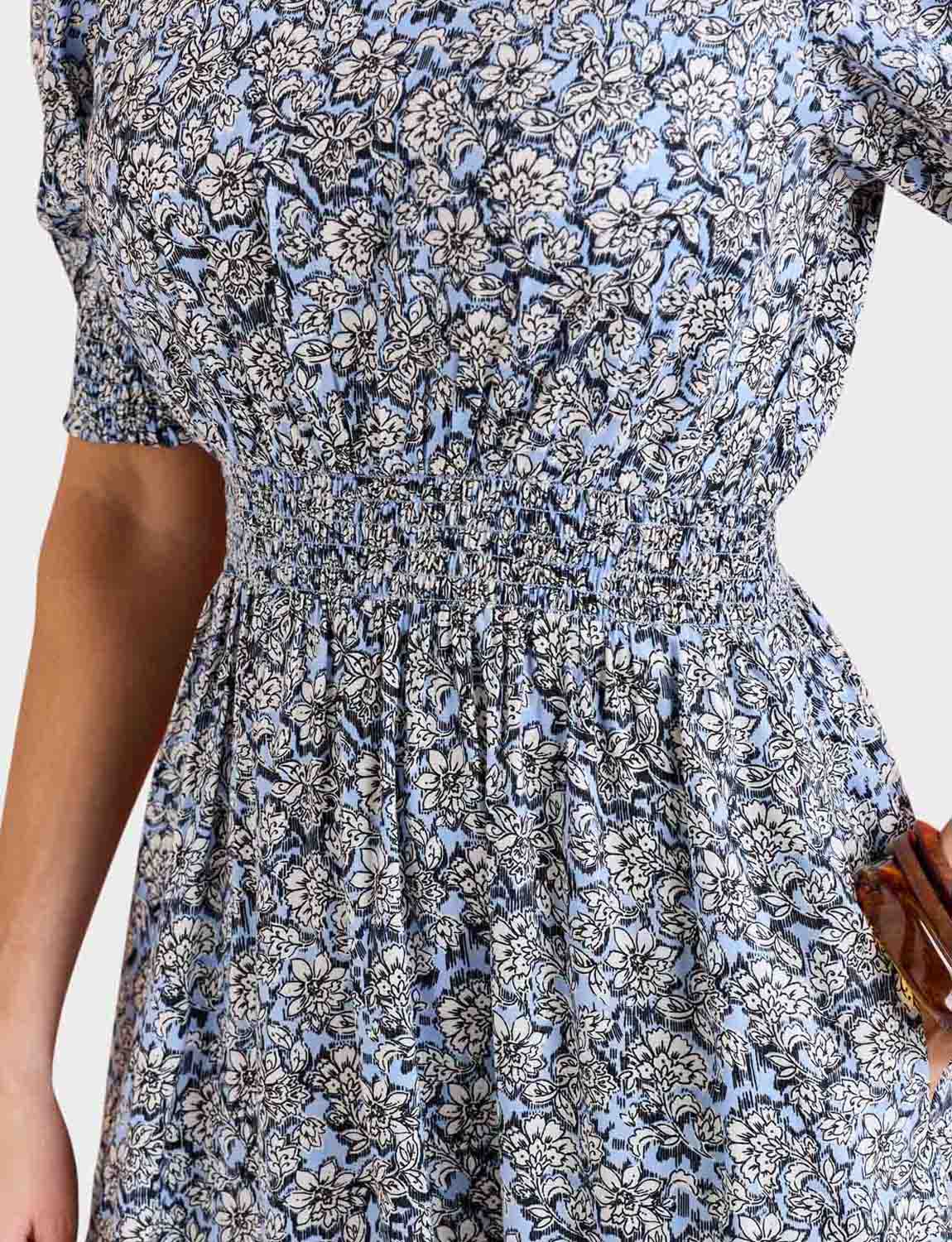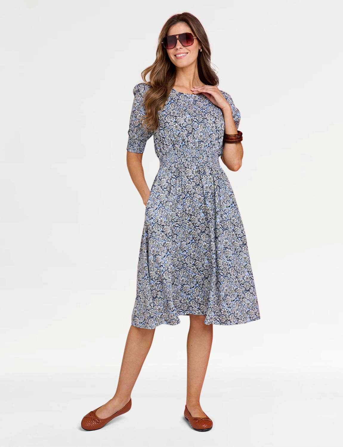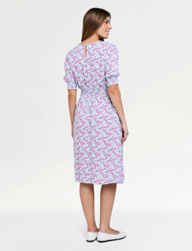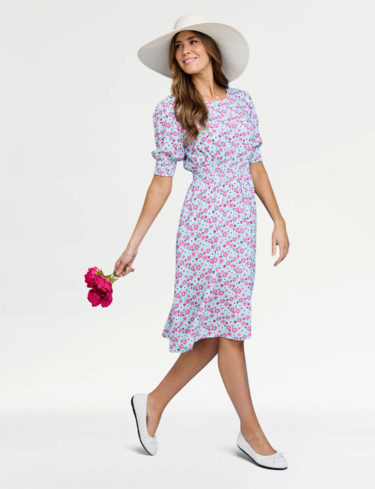 Wondering how you could style this dress? It’s the perfect base to any number of outfits, so you can easily stick to neutrals and let the floral print shine. Flat pumps or sandals work well for footwear, and you can layer up with a simple cardigan or denim jacket for cooler evenings. The dress even has pockets, perfect for keeping hold of lip balms or purses without a bag.