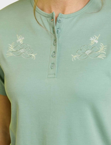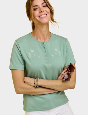 Keep it casual and carefree in our ladies’ grandad top with embroidery. Our pretty top is sure to make an impression with its eye catching embroidery. A delicate floral motif is beautifully stitched into the fabric for an effortless elegance, and a smart button up placket completes the design.
