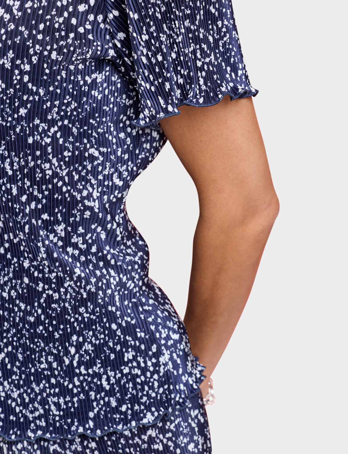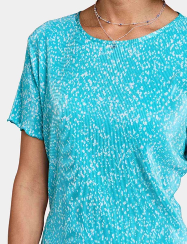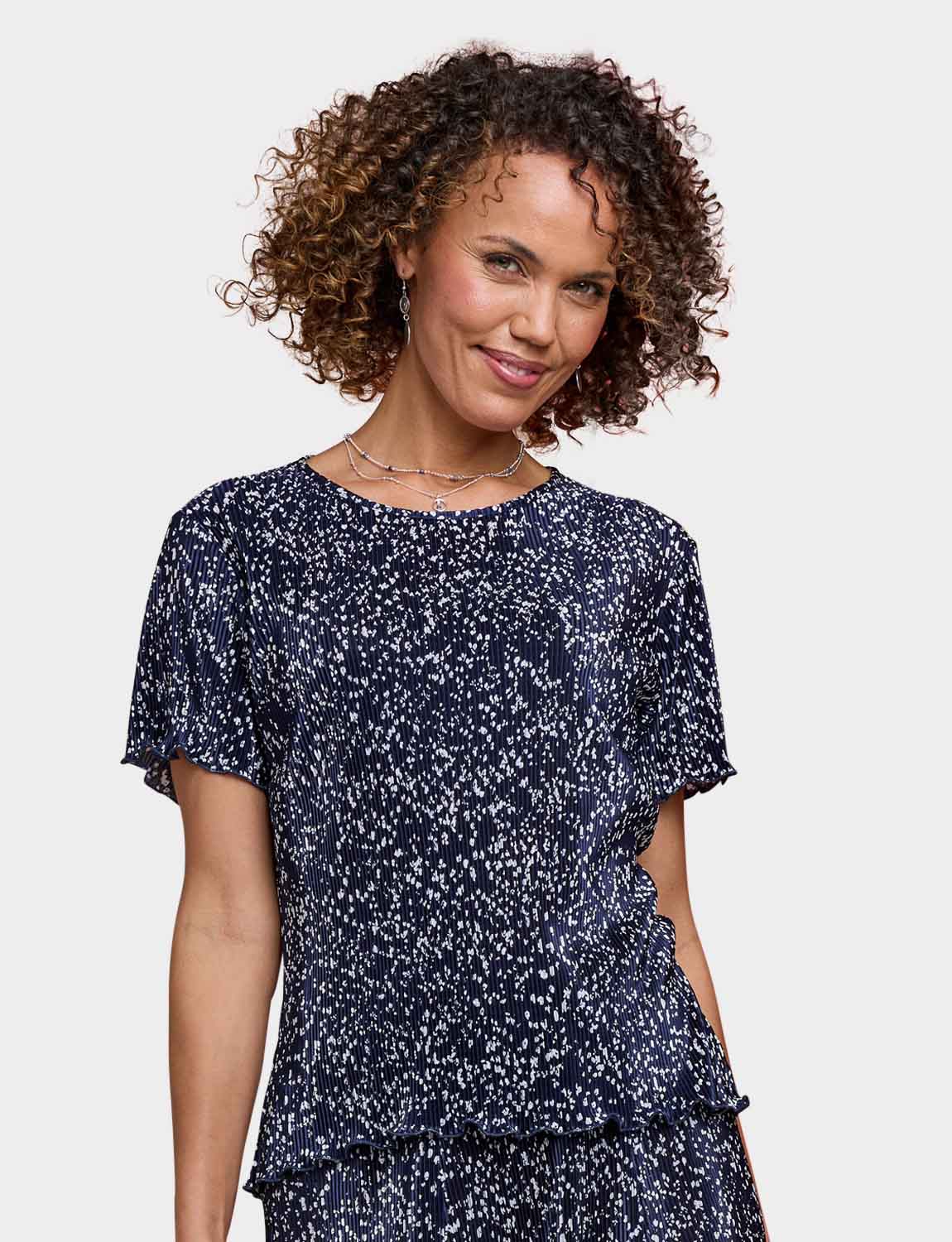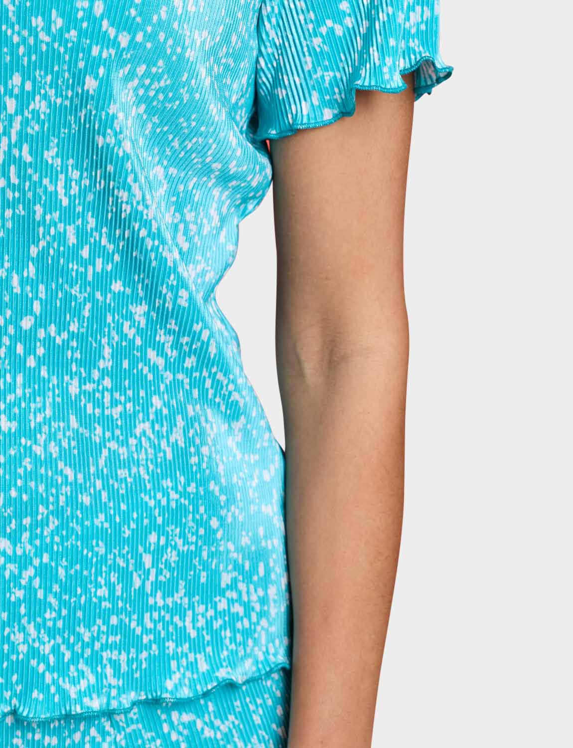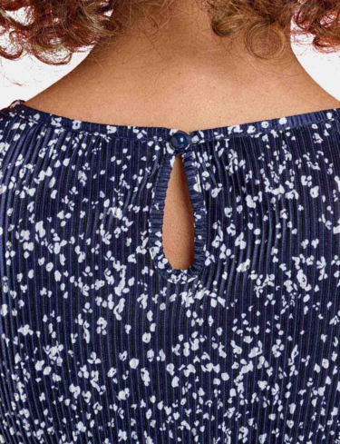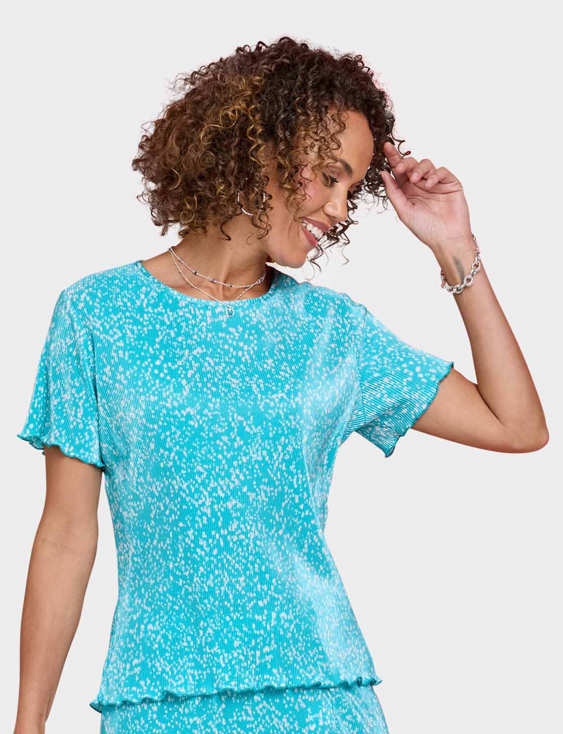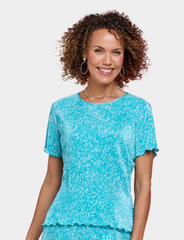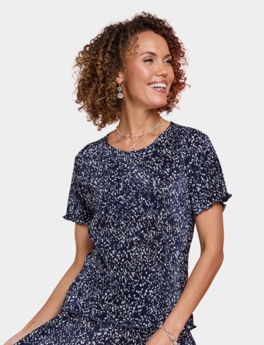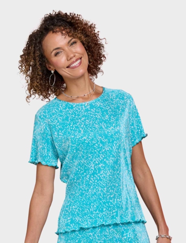 Keep it cool and carefree in our ladies’ plisse top. Sure to make the right impression with it's delicate print, this pretty top is delicately fluted at the sleeve and hemline to complement the design.