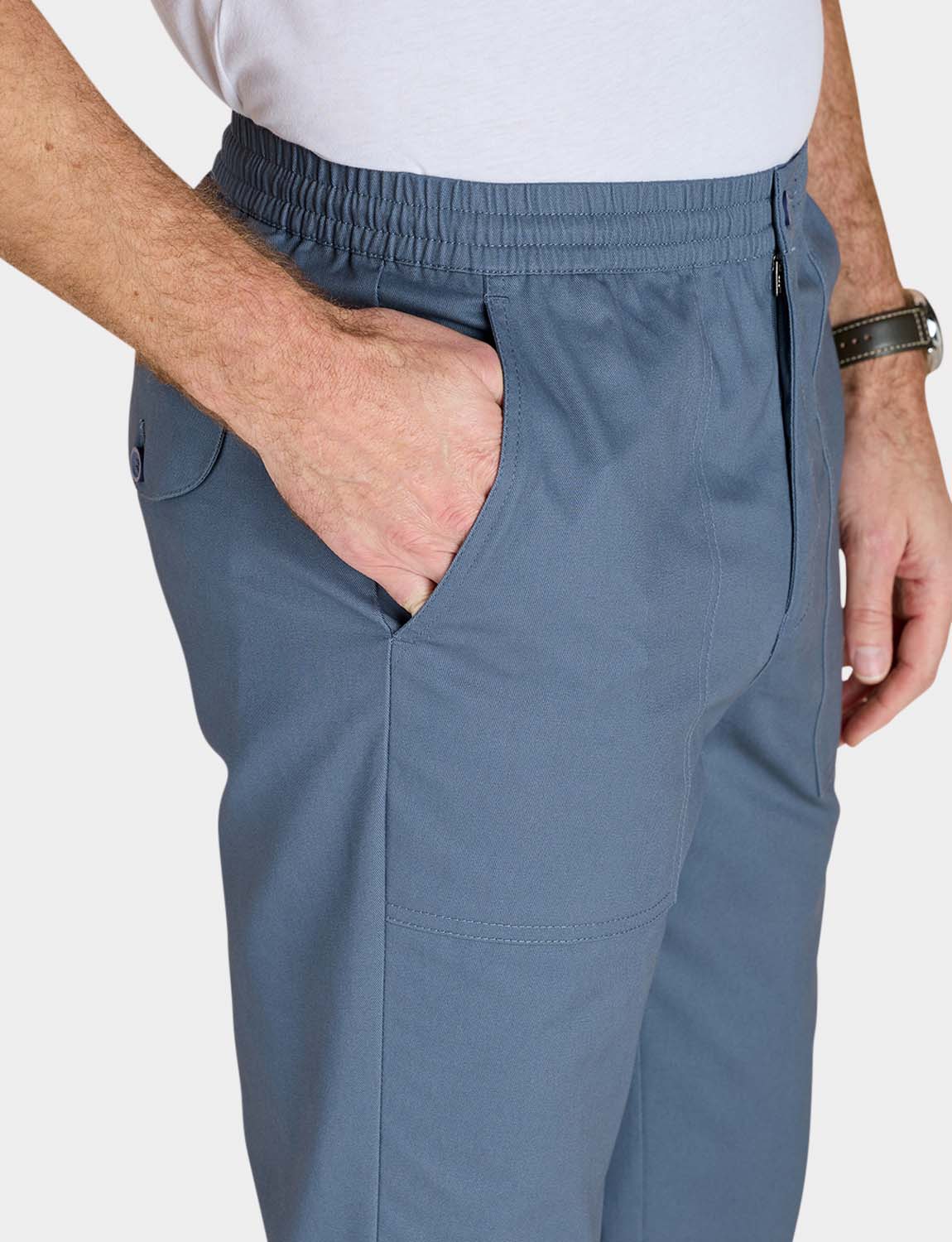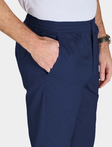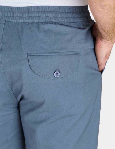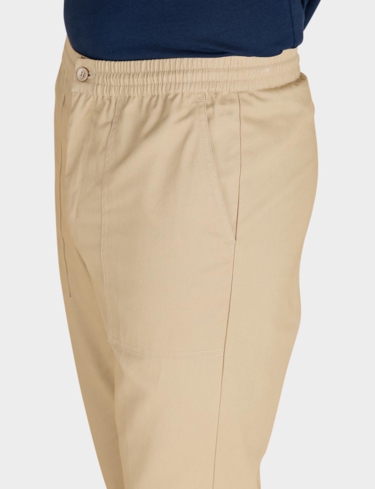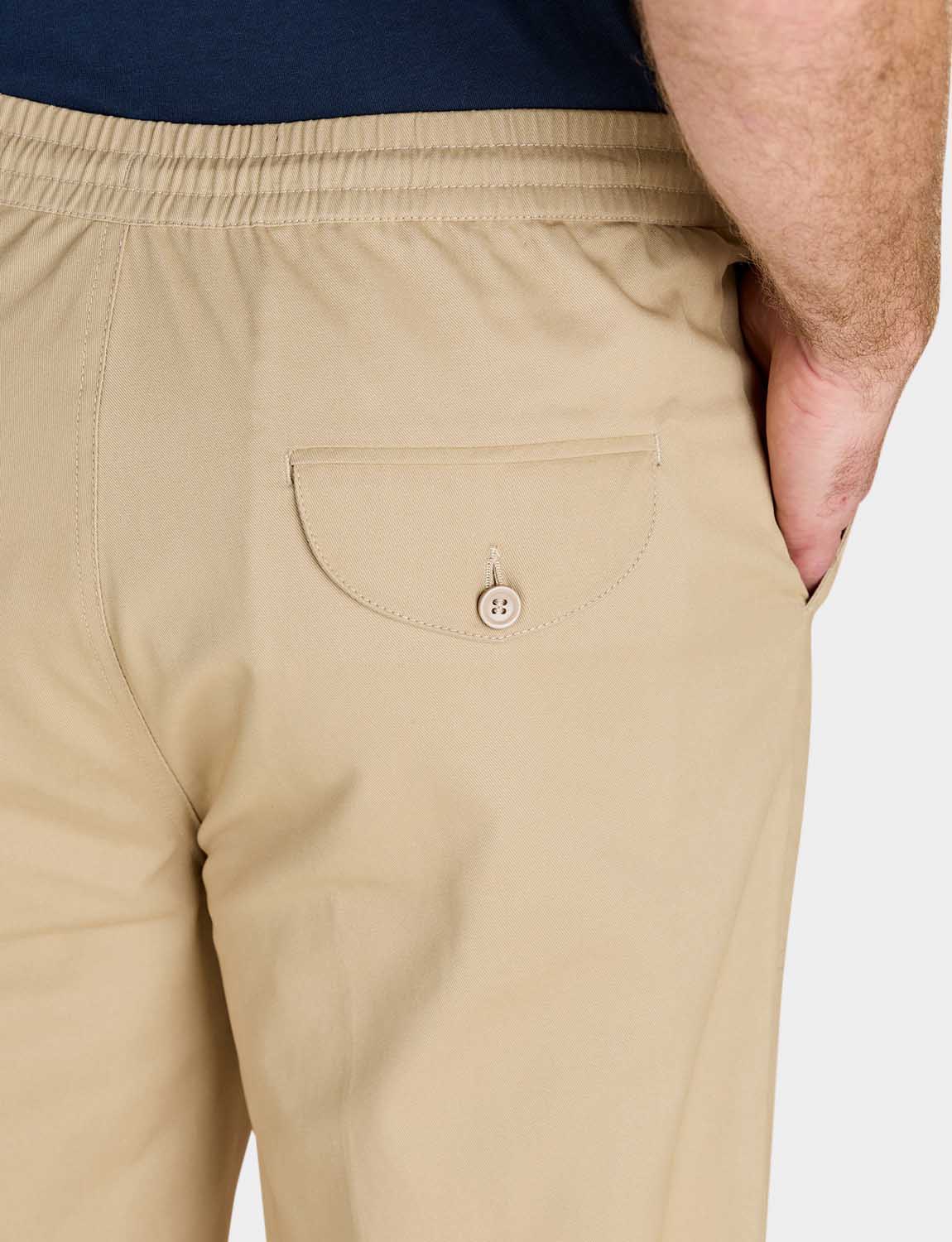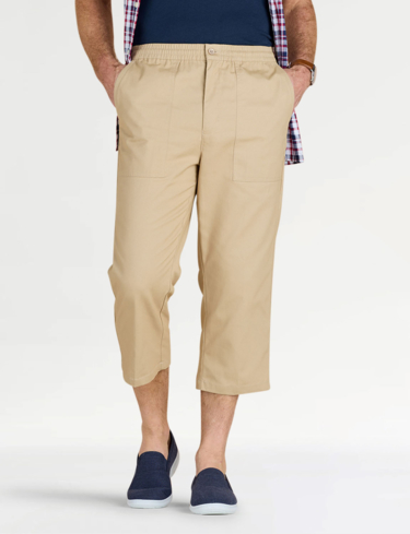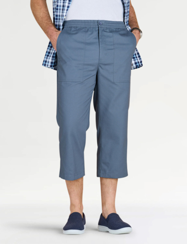 Crop trouser with fully elasticated stretch waistband with zip fly, button fastening and adjustable drawcord inside. 2 side and 1 back pocket. Inside leg approx 20".
