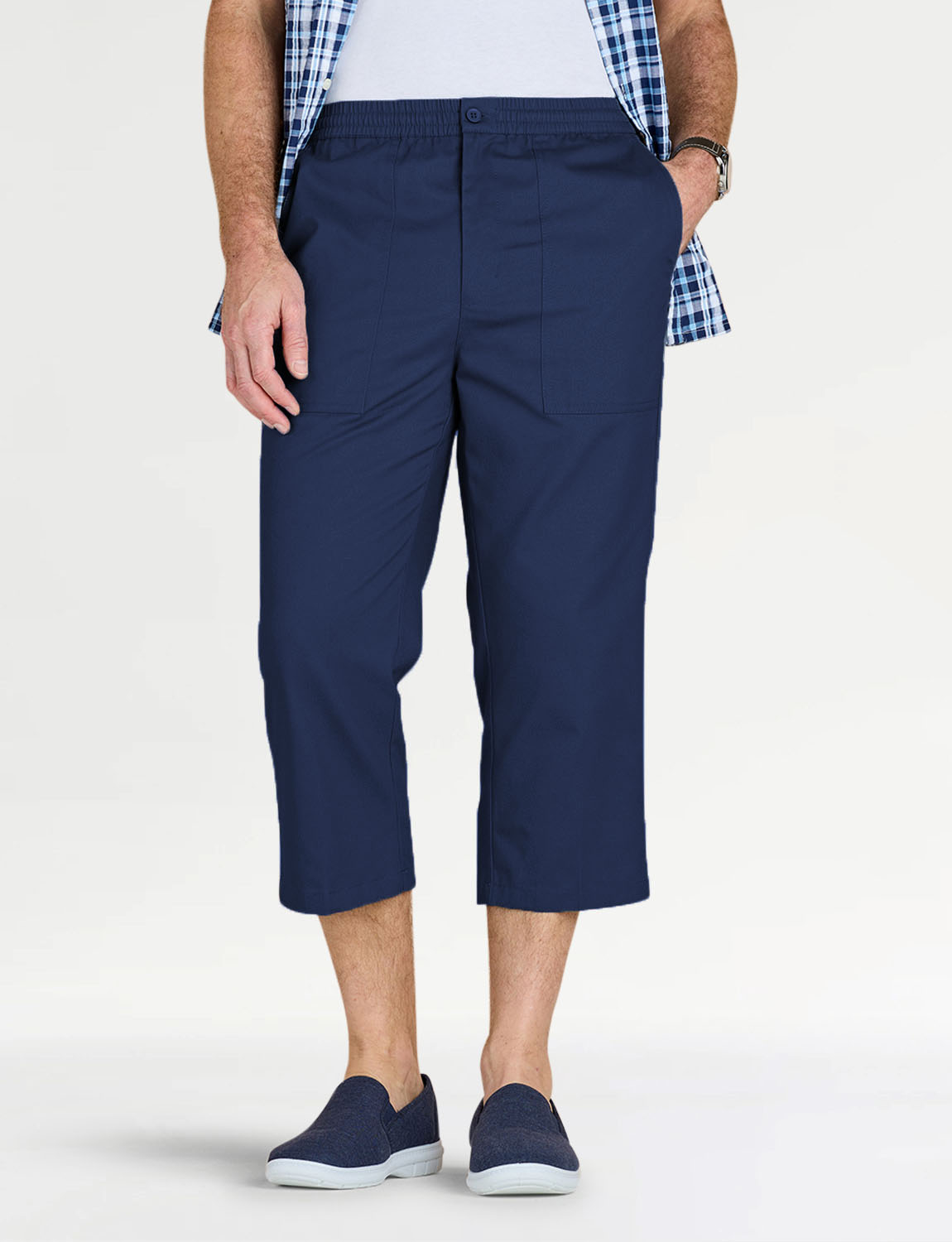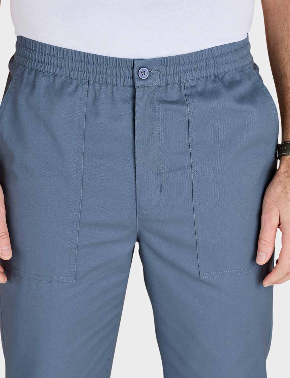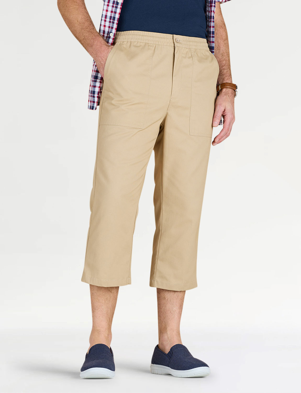 Crop trouser with fully elasticated stretch waistband with zip fly, button fastening and adjustable drawcord inside. 2 side and 1 back pocket. Inside leg approx 20".